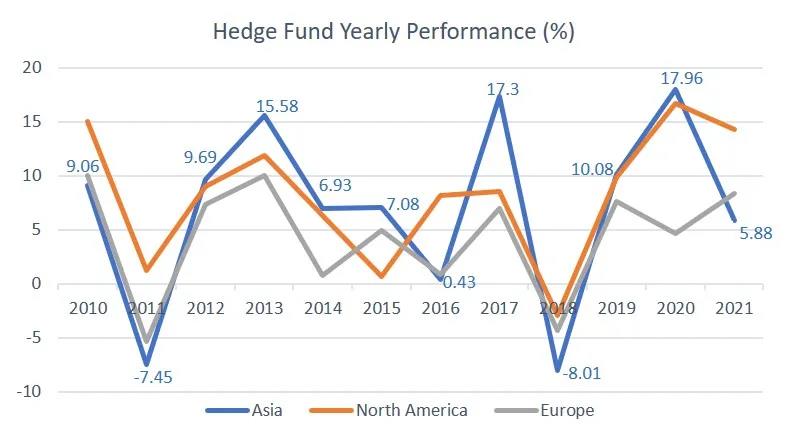 據(jù)對沖基金研究機(jī)構(gòu)Eurekahedge,2021年亞洲對沖基金收益率為5.88%,低于2020年的水平。回顧過去12年,多數(shù)年份對沖基金在亞洲的表現(xiàn)都優(yōu)于北美與歐洲。
