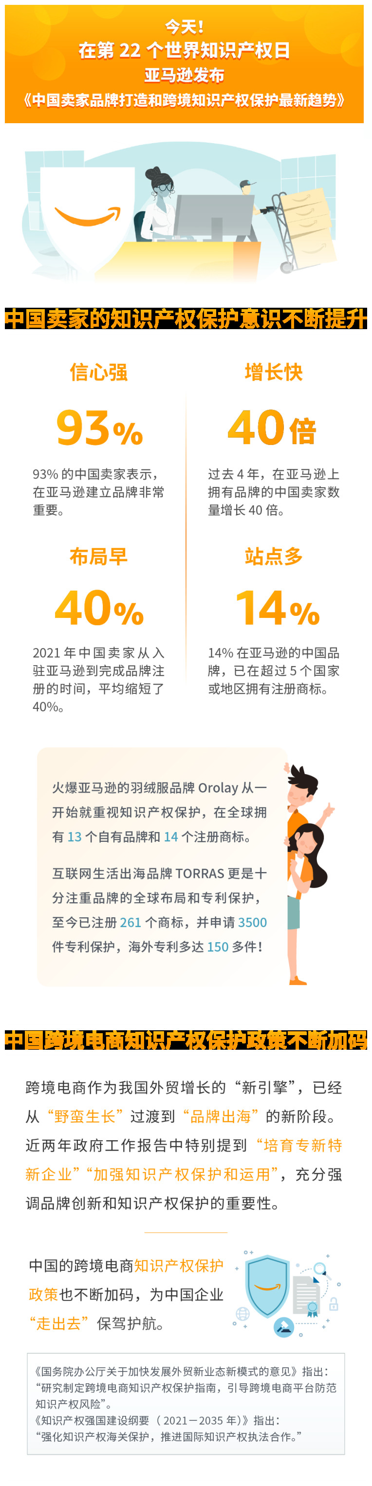 隨著經(jīng)濟(jì)的發(fā)展,跨境電商賣(mài)家對(duì)知識(shí)產(chǎn)權(quán)、對(duì)品牌日漸重視,在第22個(gè)世界知識(shí)產(chǎn)權(quán)日亞馬遜發(fā)布了《中國(guó)賣(mài)家品牌打造和跨境知識(shí)產(chǎn)權(quán)保護(hù)最新趨勢(shì)》。