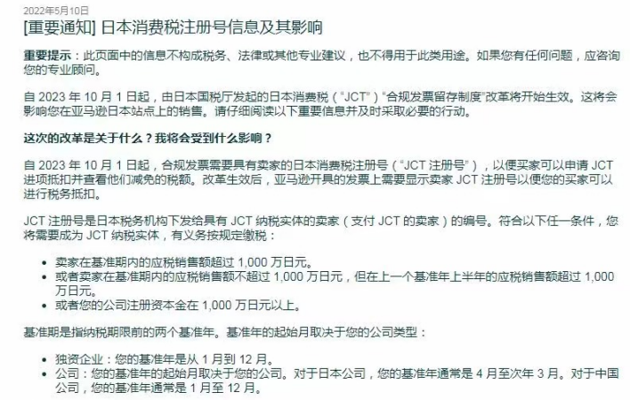 5月10日,亞馬遜日本站的賣家后臺都收到一則通知,日本消費稅(JCT)“合規(guī)發(fā)票留存制度”改革將于2023年10月1日起生效。根據(jù)合規(guī)要求,日本賣家需要注冊消費稅號JCT,否則將無法開具發(fā)票,無法讓買家申請JCT進項抵扣并查看他們減免的稅額。