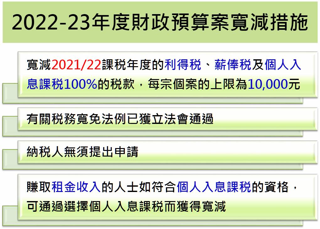 稅務(wù)局局長譚大鵬在記者招待會上介紹,《2022年收入(稅務(wù)寬免)條例草案》已于4月6日獲立法會通過,落實(shí)政府在2022/23年度《財政預(yù)算案》提出的稅務(wù)寬免,即寬減2021/22課稅年度百分之百的利得稅、薪俸稅和個人入息課稅,每宗個案以10,000元為上限。納稅人只需如常填報2021/22課稅年度報稅表,有關(guān)寬減會在評稅中反映。