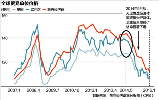 不過,盡管全球貿(mào)易體量相對穩(wěn)定,但全球貿(mào)易價格出現(xiàn)了明顯下滑。根據(jù)荷蘭經(jīng)濟政策分析部(CPB)的數(shù)據(jù),無論發(fā)達(dá)經(jīng)濟體抑或新興經(jīng)濟體,全球貿(mào)易單位價格在2014年5月后均出現(xiàn)了顯著下滑。2016年1月,全球貿(mào)易單位價格指數(shù)低于2009年3月的低點。
