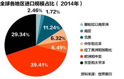 根據(jù)世界銀行的2014年數(shù)據(jù),全球進(jìn)口需求主要來自于歐洲和中亞(39.41%)、東亞和太平洋(29.34%)以及北美(11.24%)三大地區(qū),這三個地區(qū)的進(jìn)口總量占到了全球進(jìn)口總需求的80%。全球出口結(jié)構(gòu)顯示出類似的格局。