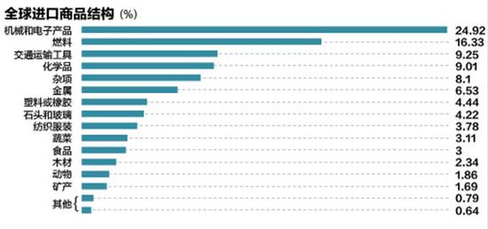 根據(jù)世界銀行的數(shù)據(jù),全球進(jìn)口量最大的產(chǎn)品是制造品,占比高達(dá)66.33%,包括機械和電子產(chǎn)品(24.92%)、交通運輸工具(9.25%)、化學(xué)品(9.01%)等。同時,燃料、金屬、礦產(chǎn)、農(nóng)產(chǎn)品等大宗商品進(jìn)口占比超過全球進(jìn)口總量的20%,尤其燃料的進(jìn)口規(guī)模達(dá)到16.33%。全球出口產(chǎn)品也擁有類似的結(jié)構(gòu)。