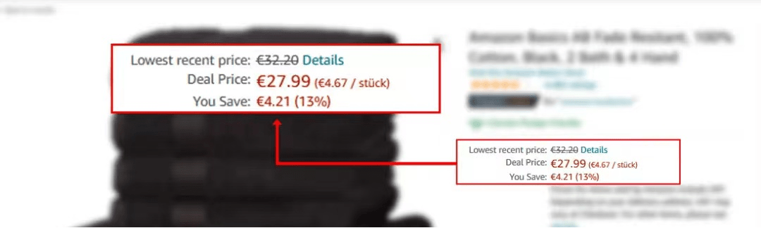 因此,亞馬遜歐洲站(除英國(guó)站外)的商品已經(jīng)(或?qū)?huì))顯示過去30天該商品在亞馬遜商城的最低價(jià),標(biāo)記為“近期最低價(jià)(Lowest recent price)” ,如下圖所示。鮮明的價(jià)格對(duì)比會(huì)增加視覺沖擊力,也能讓您的商品更具競(jìng)爭(zhēng)力和吸引力。