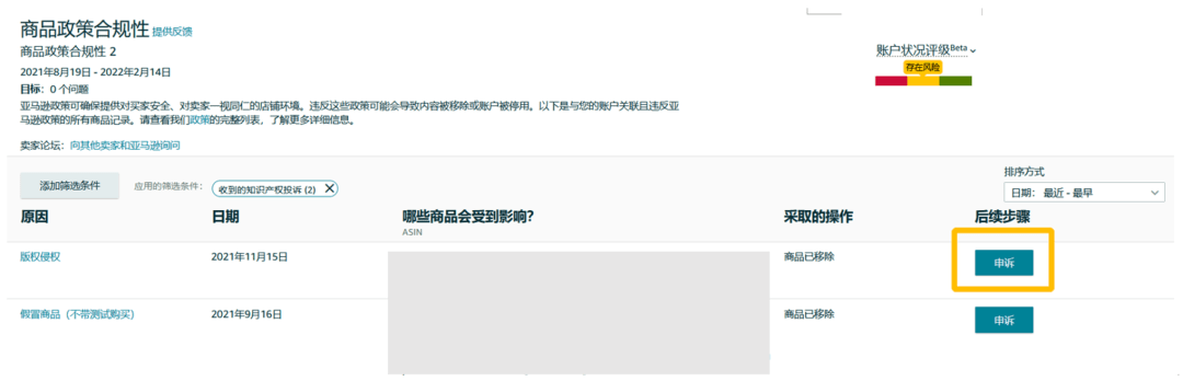通過“商品政策合規(guī)性”頁面,您可以看到違反亞馬遜政策的商品記錄。當您看到“涉嫌侵犯知識產(chǎn)權(quán)” 、 “知識產(chǎn)權(quán)投訴” 兩欄內(nèi)容有警示,則意味著可能存在侵權(quán)問題。接下來您可以對該頁面中顯示的違規(guī)問題進行申訴。