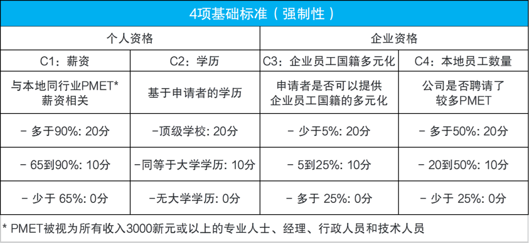 每個(gè)項(xiàng)目最高得分20分,總分達(dá)到40分才可申請(qǐng)/聘請(qǐng)EP。