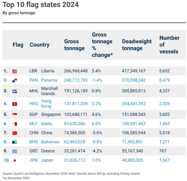 據(jù)勞氏船級社數(shù)據(jù)顯示,2024年十大船旗國排名中,前五名分別為利比里亞、巴拿馬、馬紹爾、香港和新加坡,馬耳他,其中利比里亞、巴拿馬、馬紹爾都是國際運輸業(yè)工人聯(lián)合會(ITF)認定的方便旗國家,而新加坡和香港也接受外國公司注冊船籍。