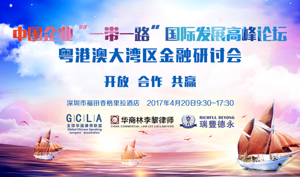 2017中國(guó)企業(yè)“一帶一路”國(guó)際發(fā)展高峰論壇暨粵港澳大灣區(qū)金融研討會(huì),由全球華語(yǔ)律師聯(lián)盟、華商林李黎(前海)聯(lián)營(yíng)律師事務(wù)所及瑞豐德永集團(tuán)聯(lián)合主辦,深圳市對(duì)外貿(mào)易企業(yè)發(fā)展促進(jìn)會(huì)、深圳市國(guó)際投資促進(jìn)中心、深圳市前海企業(yè)服務(wù)有限公司、深圳市電子商務(wù)協(xié)會(huì)共同協(xié)辦,深圳市前海香港商會(huì)作為支持單位,是首次以粵港澳大灣區(qū)金融發(fā)展為主題的國(guó)際性高峰論壇,將于2017年4月20日在中國(guó)深圳舉辦,特邀請(qǐng)您出席!
